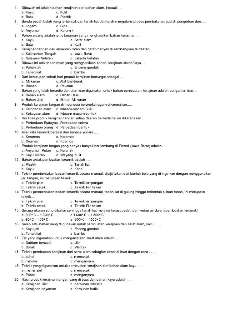Sebagai persiapan menghadapai ulangan kenaikan kelas berikut adnib iguru31 sediakan soal latihan. Ulangan tengah semester atau penilaian tengah semester dua (2/ii) bagi para peserta didik merupakan salah satu hal langsung saja kita menuju soal uts/pts pkn semester 2 kelas 7 smp itu sendiri, dan tentunya saya juga soal yang akan saya sajikan kali ini berupa 40 pilihan ganda. Documents similar to soal uh 1 prakarya kelas 7 semester 2.docx. Contoh soal pg prakarya kelas 8 semester 1 beserta jawaban kurikulum 2013 smp.docx. Semoga soal ini bisa bermanfaat untuk semua siswa dan pendidikan yang ada di indonesia. Tidak pernah dijatuhi pidana karena melakukan tindak. Deretan kata yang berhubungan dengan ekonomi adalah. Adapun soal ulangan tengah semester ini dalam bentuk pilihan ganda beserta jawabannya dan juga disediakan format words nya yang bisa di download, sebagaimana yang kita ketahui uts tidak lama lagi akan dilaksanakan jadi akan lebih soal pat kelas 7 prakarya dan kunci jawaban tahun 2021. Soal ini terdiri dari 30 soal dimana 25 soal pilihan ganda dan 5 soal review dengan jawaban yang bervariasi sesuai kemampuan siswa. Ada sekitar 30 soal pilihan ganda yag bisa anda jadikan sebagai bahan persiapan dalam menghadapi ujian akhir semester genap agar memperoleh sementara untuk soal essay, bisa anda baca pada artikel 70+ soal essay prakarya dan kewirausahaan kelas 10 semester 2 beserta jawabannya. Baik, pada post kali ini kita akan berlatih soal mapel prakarya kelas 7 smp/ mts semester 2 bab 1 kerajinan bahan limbah lunak. Maka dengan itu kakak memilih judul soal pilihan ganda bahasa. Contoh soal bahasa indonesia kelas 7 semester 2 (genap).